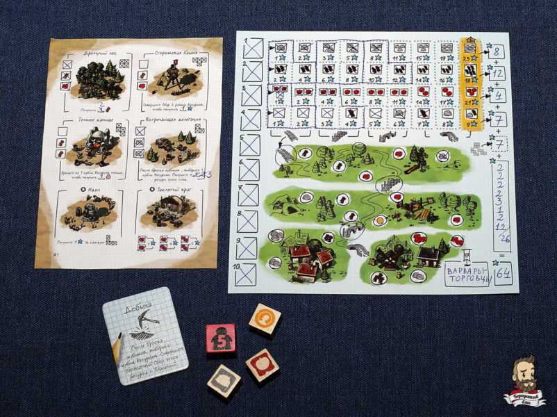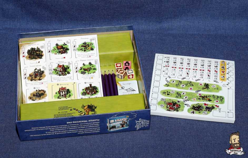 В небольшой коробке нас ждут аж три разных блокнота, четыре приятных деревянных кубика, столько же карандашей, пять жетонов и правила. Игровой процесс довольно типичен для подобных игр. Каждому игроку выдается по одному большому листу Империи и по одному маленькому листу Поселения, который выбирается либо из блокнота Соревнований, с одинаковыми постройками, либо из блокнота Приключений, где все листы уникальны. В центр стола выкладывают случайные жетоны Благ по числу участников плюс один, то есть три жетона на двоих, четыре жетона на троих и все пять на четверых игроков.