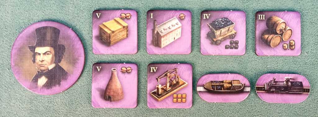 Жетоны предприятий. У каждого игрока 45 жетонов предприятий. Жетоны разделены на 6 групп — мануфактуры, текстильные фабрики, пивоварни, гончарные мастерские, литейные заводы, угольные шахты. В каждой группе жетоны отличаются только уровнем, который скромно указан в верхнем левом углу. Кроме этого, у каждого игрока все жетоны одинаковой формы и цвета. Это сказывается на времени стартовой раскладки — приходится всматриваться в каждый жетон и выкладывать на предназначенное для него место. При этом велика вероятность допустить ошибку и положить предприятие не туда. Если же вы педант и после раскладки жетонов сравните ваши планшеты и количество жетонов в каждой стопке, то сможете быстрой обнаружить ошибку. В противном случае вы узнаете об ошибке в процессе игры, когда уже будет поздно.