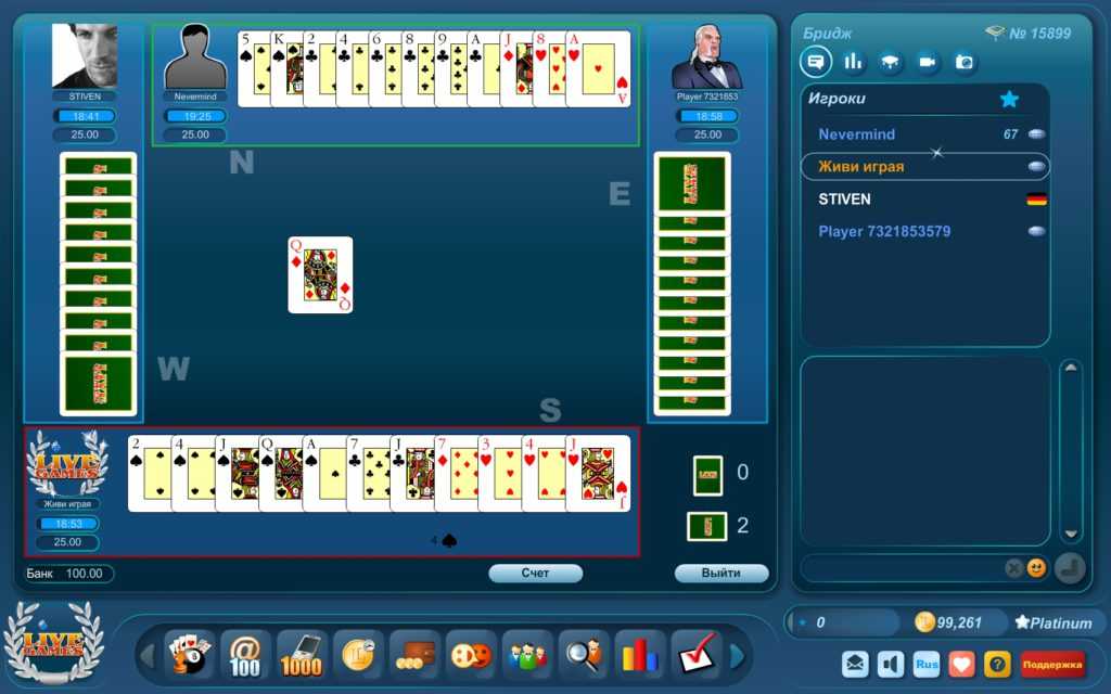 Робберный бридж – это игра на 4 человек. Игра ведется стандартным набором карт – 52 карты. Игроки делятся на 2 команды. Партнеры садятся друг напротив друга.