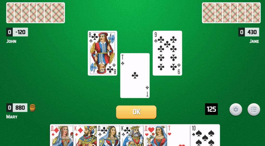 Игра ведется колодой из 36 карт, хотя в раздаче участвуют только 32 – шестерки служат для других целей. Это, а также не похожая на другие система козырей, делает игру интересной и необычной.