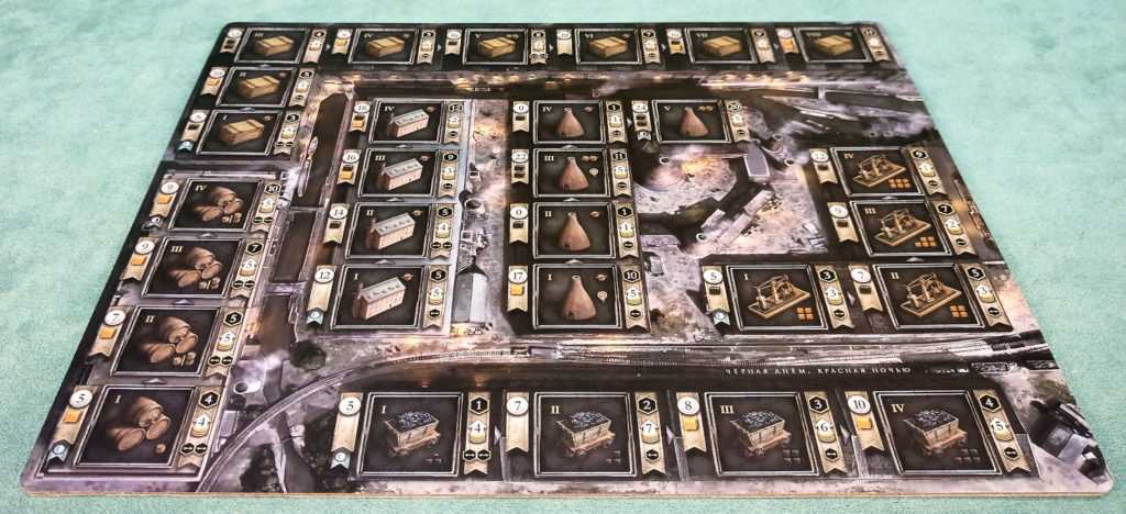 Планшет представляет собой территорию промышленного предприятия с железными дорогами и каналами. По берегам каналов горит свет, а из труб строений идет дым. С планшетами игроков такая же история что и с игровым полем — один и тот же планшет на обеих сторонах, только в разной цветовой гамме. И такой же вопрос. Зачем?