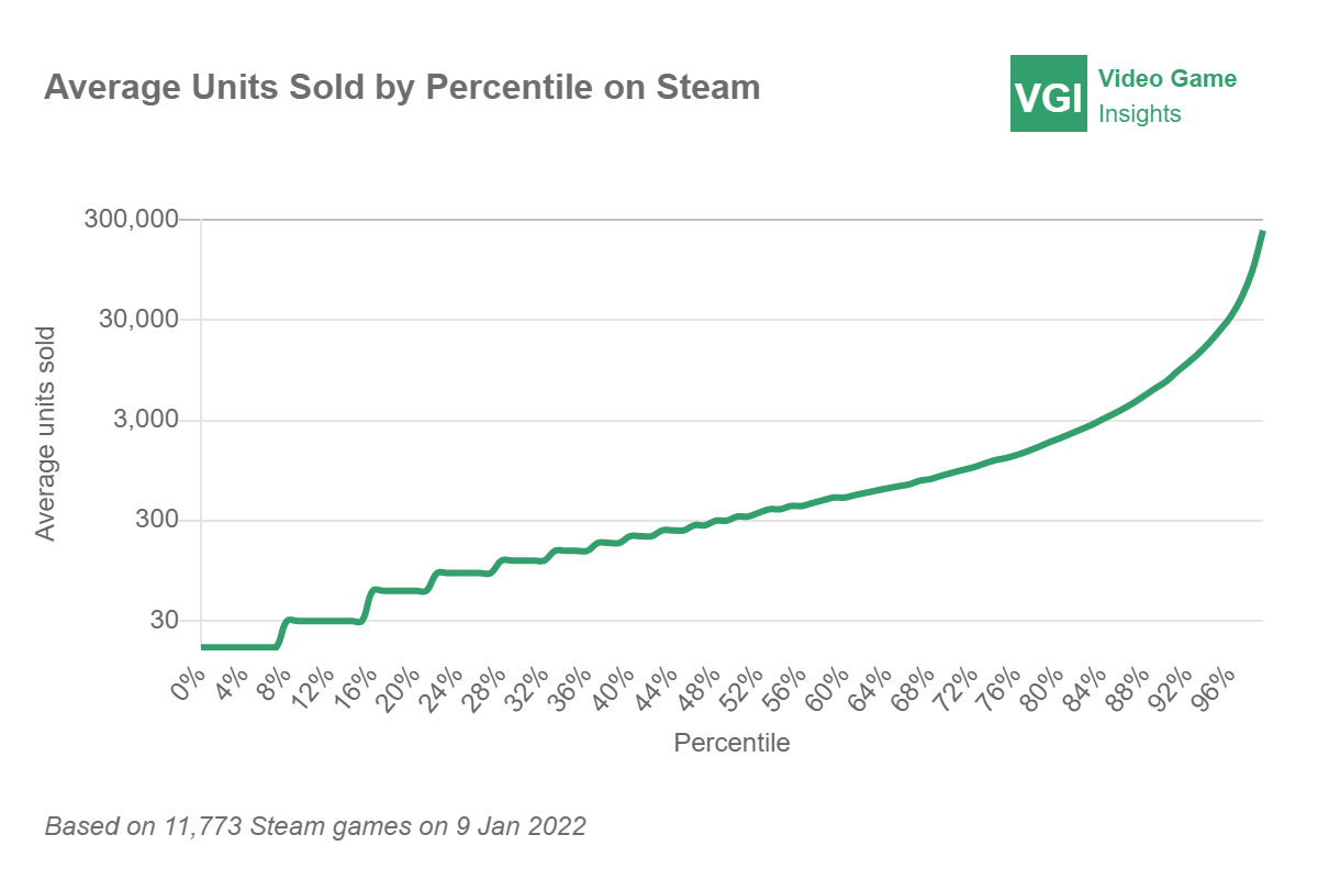 27% игр в 2021 году продались тиражом меньше 100 копий. При этом лишь 8% тайтлов достигли продаж от 10 тысяч копий.