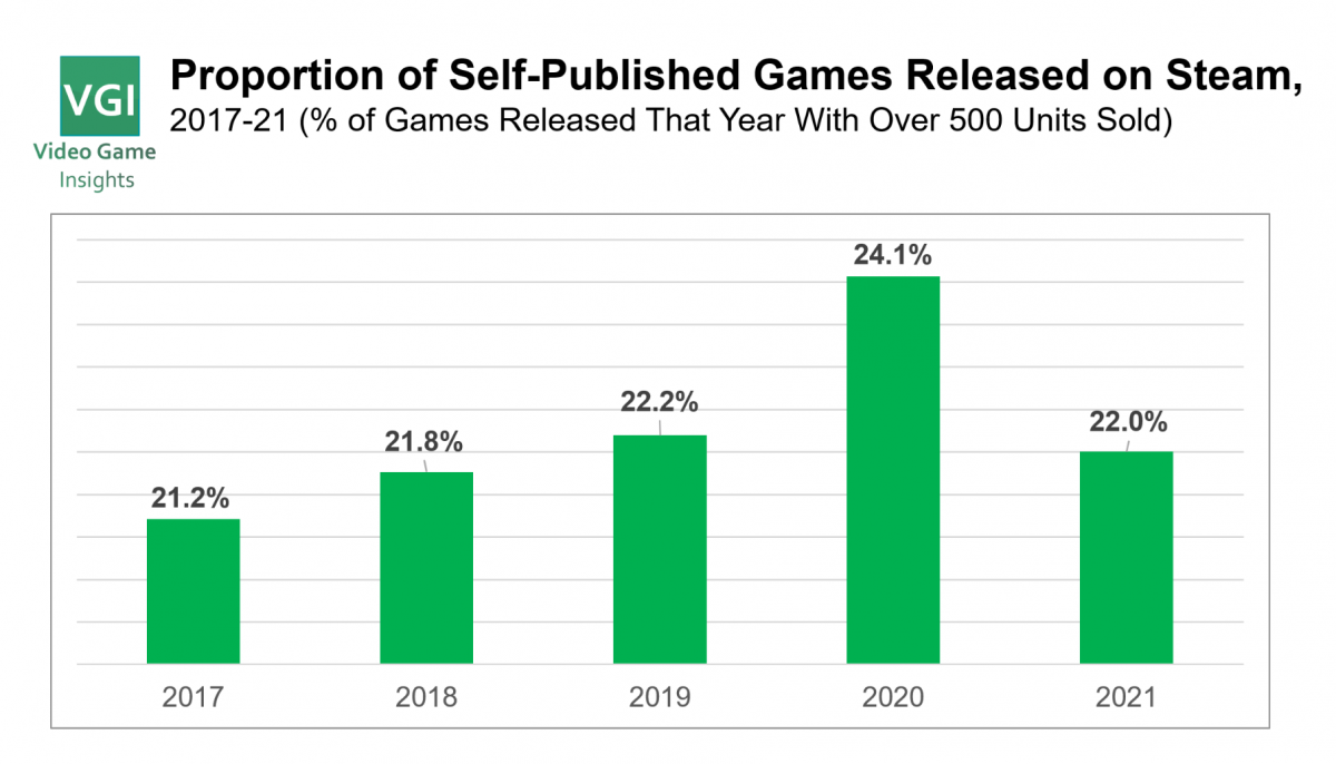 Доля игр, выпущенных без издателя, с 2017 по 2021 годы (среди проектов с продажами от 500 копий)