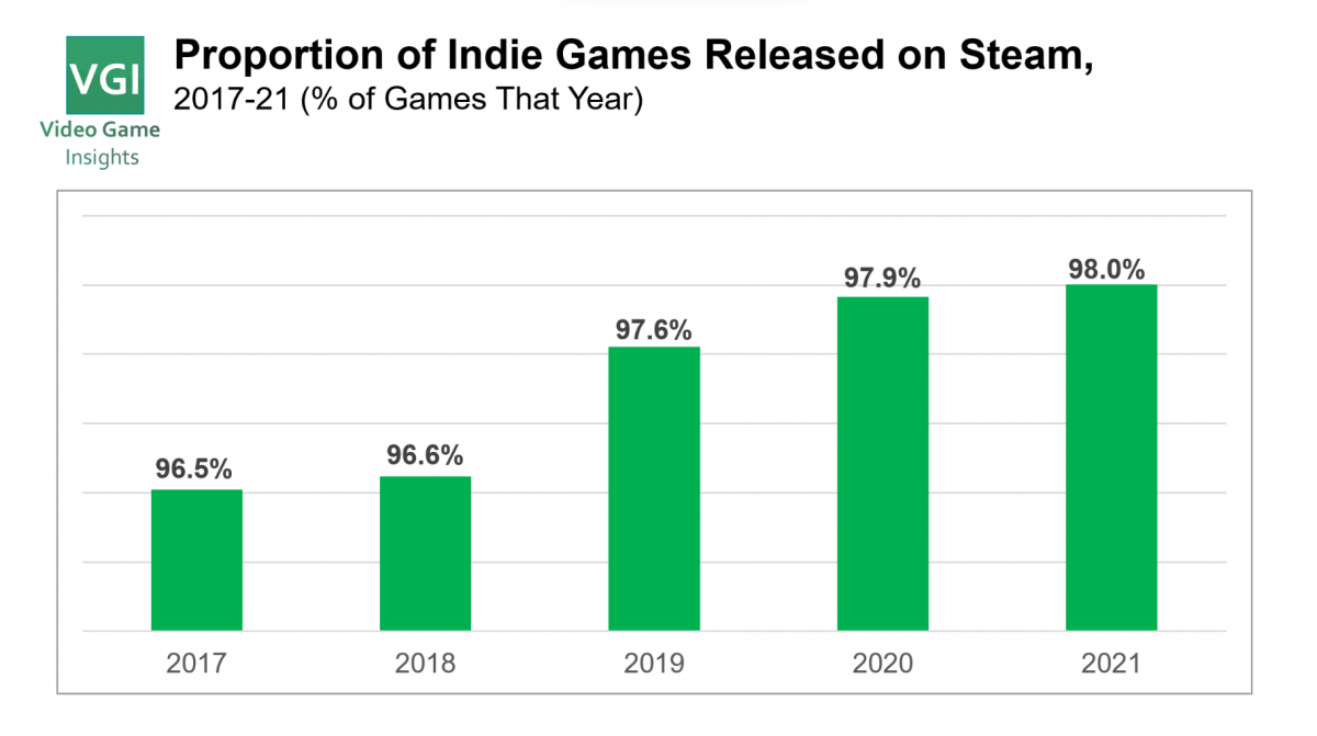 - Доля инди-игр в Steam растет с каждым годом. В 2021-м на них пришлось 98% всех выпущенных тайтлов.
