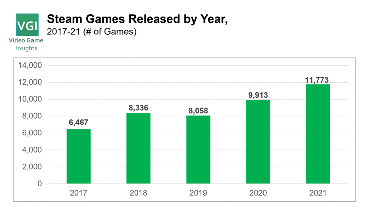 - За 2021 год в Steam вышло 11773 игры — почти на две тысячи больше, чем годом ранее (2020-й тоже был рекордным по этому показателю).