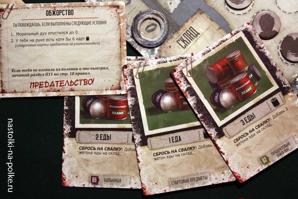 Каждый игрок получает пять случайный карт предметов. Можно оказаться с пятью канистрами бензина, но без единой аптечки или крошки хлеба. Остальные предметы распределяются между локациями.