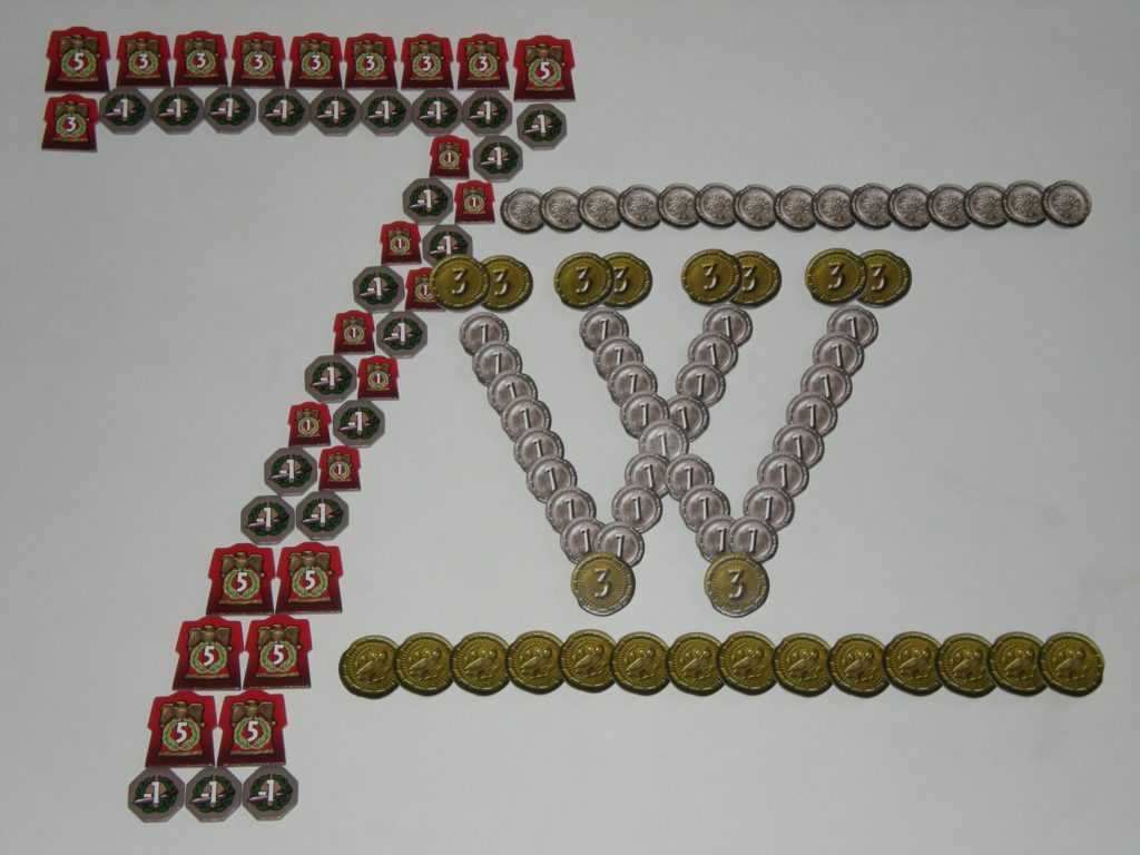 В начале игры каждый игрок получает по 3 монеты. Торговля проста – продал карту за 3 монетки, купил ресурс у соседа за 2 монетки.