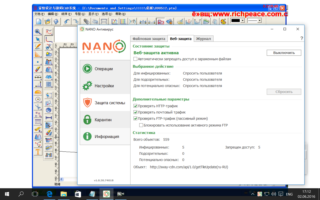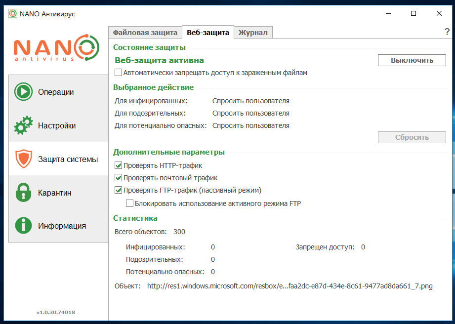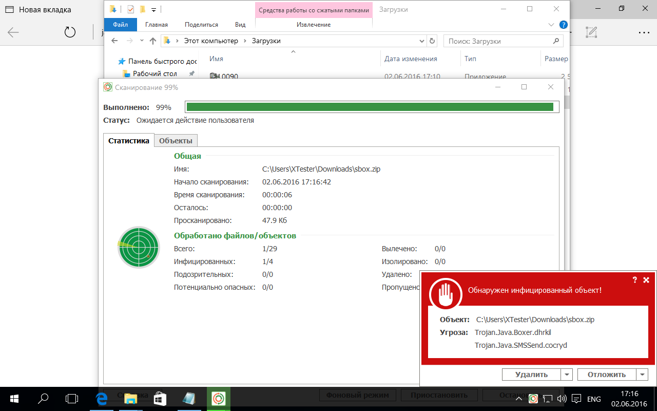 От фишинга NANO Антивирус защитить не смог. Поддельные страницы загружались без предупреждения. Спасовал он и при проверке JAR-файла, ошибочно сообщив о его безопасности. В девятом тесте NANO Антивирус позволил загрузить архив ZIP с зараженным джава-файлом, но обнаружил в нем угрозу при выборочном сканировании по запросу.