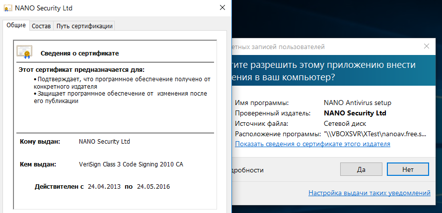Срок действия цифрового сертификата, выданного NANO Security Ltd, на момент теста истек, однако это не помешало установке последней версии NANO Антивируса.
