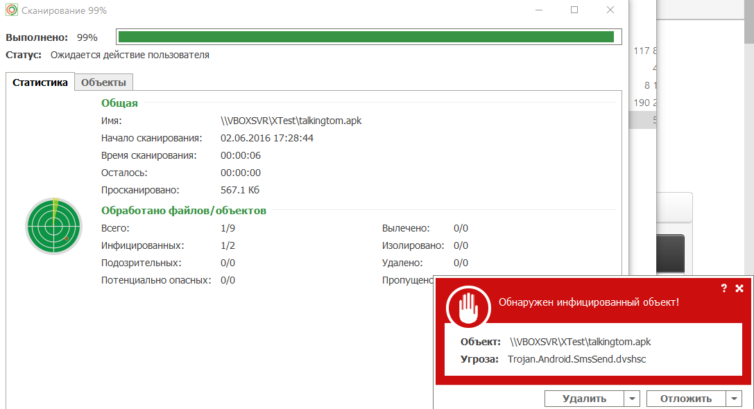 Так же произошло и в последнем тесте. Протрояненный APK-файл загрузился без проблем, но был идентифицирован как опасный при ручном сканировании.