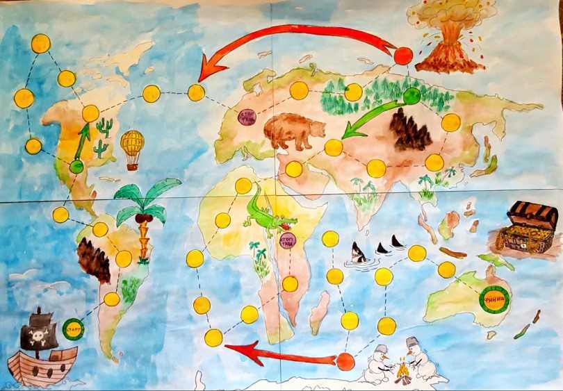 Самый простой вариант – игровое поле с дорожкой, состоящей из пронумерованных клеток. Он подойдет малышам, которые только осваивают цифры. Чем старше дети, тем больше сложностей можно предусмотреть: например, составить поле из отдельных квадратов, которые могут поворачиваться во время игры, или подтолкнуть игроков к переговорам, торговле и блефу.