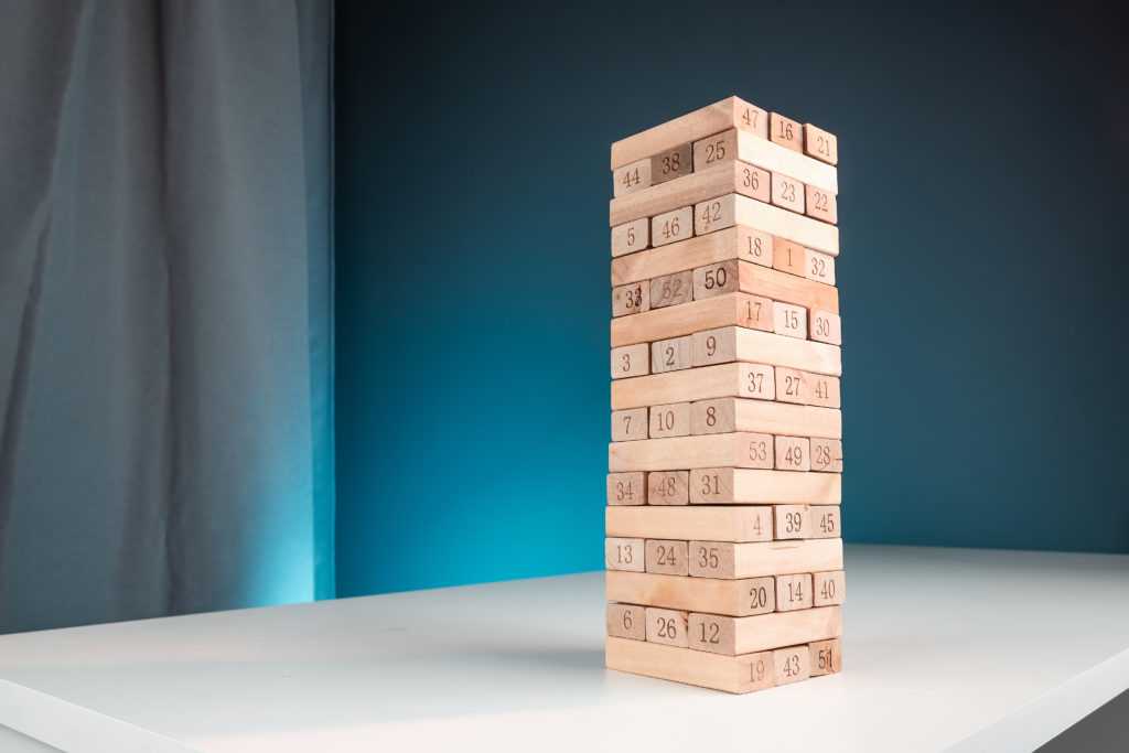 Изначально нужно высыпать все бруски из коробки на ровную горизонтальную поверхность и их них создать высокую башню, которая будет состоять, в среднем, из 18 уровней. Каждый этаж формируется на основе трех деревянных блоков, которые располагаются под правильным углом. Справиться с неровностями, недочетами можно при помощи рукава.
