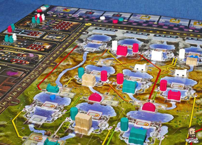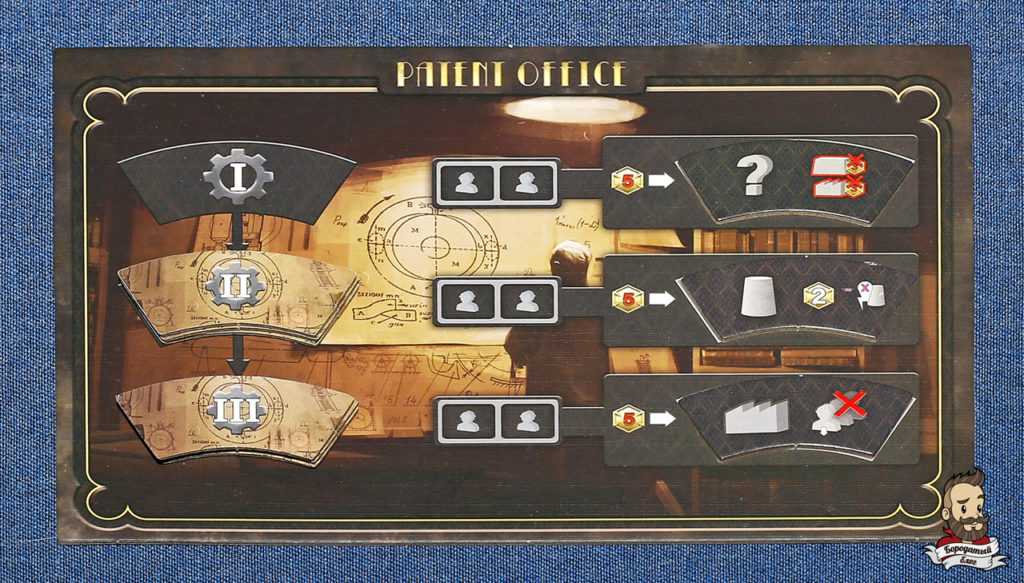 Действия, представленные на общем планшете, более разнообразны, но здесь вам уже могут помешать соперники. Выставив своих инженеров на ту или иную ячейку, вы сможете производить энергию, используя накопленную плотинами воду, прокручивать колесо строительства на определенное количество сегментов, получать ресурсы и деньги, добавлять воду на тайлы верховий или вводить дополнительную каплю воды в игру, а также получать контракты. К тому же, если вы играете в полный вариант игры, будет доступен отдельный планшет, где за инженеров и денежные средства можно приобрести тайлы продвинутых технологий.
