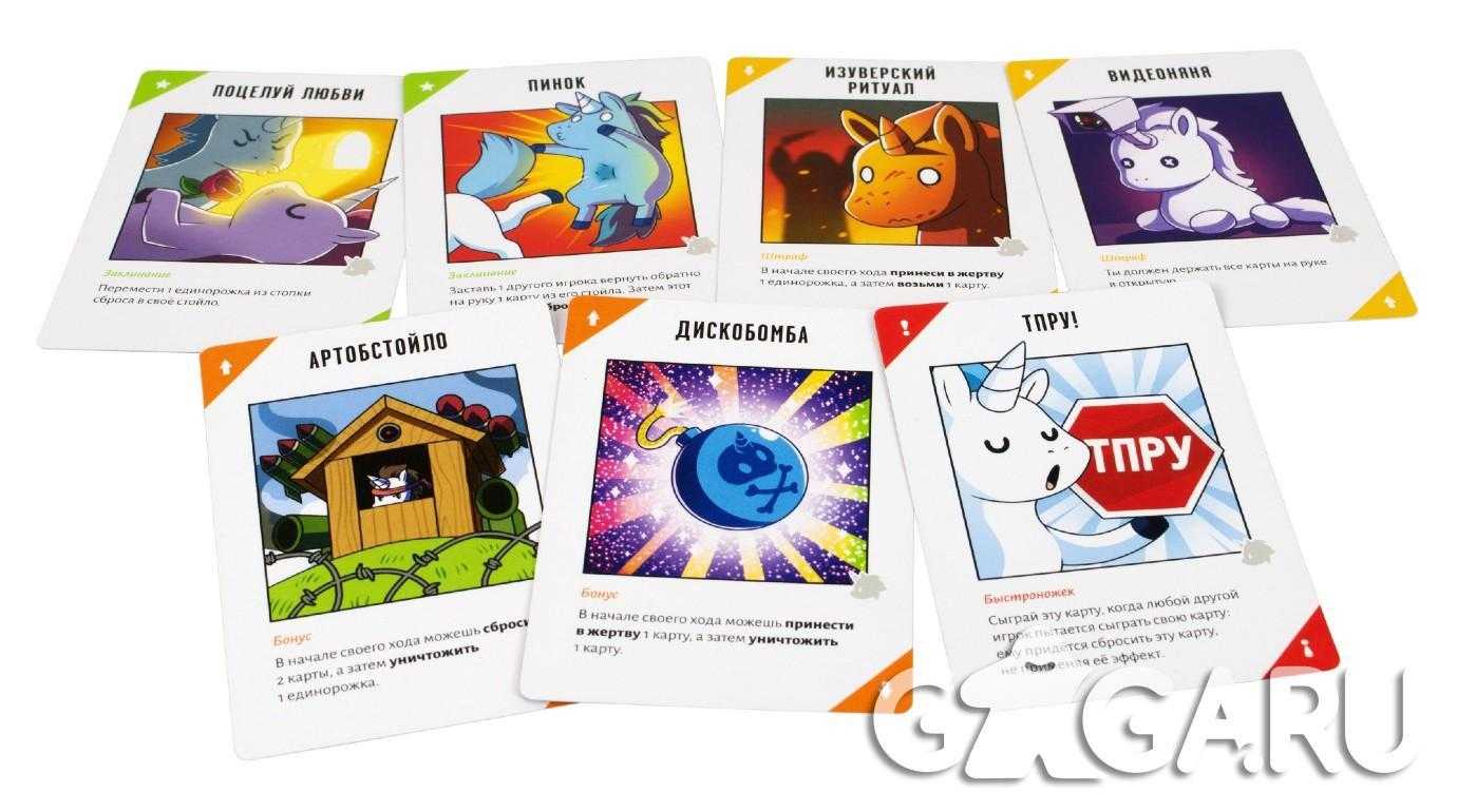 Эта игра затягивает, словно катание на радужных американских горках — ситуация за столом меняется молниеносно, единороги то появляются, то исчезают, заставляя игроков испытывать весь спектр ярких эмоций. В партии наметился лидер? Скорее заваливайте его штрафами и неприятными заклинаниями! О, нет, теперь все ополчились против вас — защитите себя надежной карточкой «Тпру», отменяющей все эффекты!