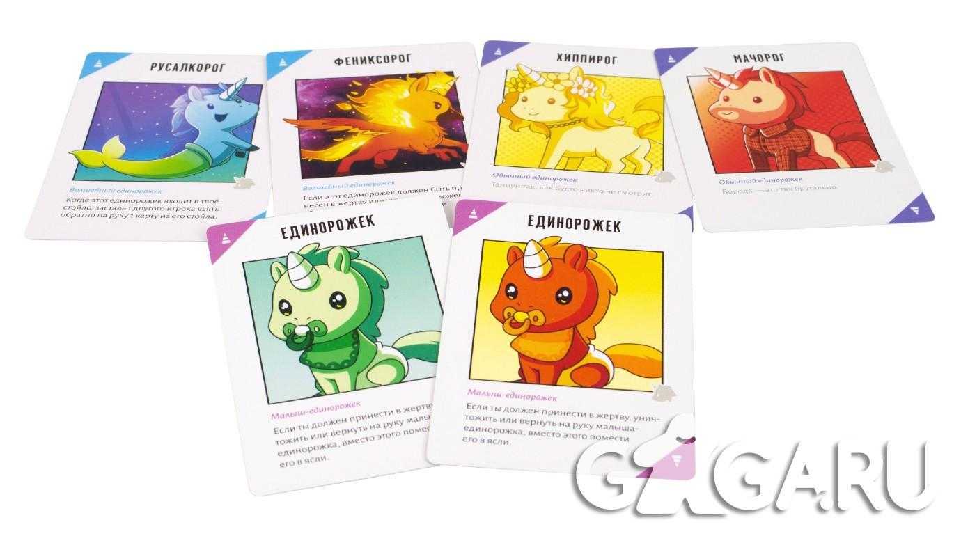 Вообще все единорожки — неудержимые, но также они бывают трех видов. В яслях обитают подрастающие малыши-единорожки, они пока еще ничего не умеют и появляются в стойлах только благодаря эффектам других карт. Обычные единорожки такие классные, что уже претендуют на место не только в вашем стойле, но и в сердечке. И самые желанные рекруты в необычной коннице — волшебные единорожки — обладают полезными навыками, надо только не забывать вовремя ими пользоваться. В комплекте 140 карт самых разных бонусов, заклинаний, штрафов и, конечно, единорогов. Пламенный фениксорог и модный тинейджерог, опасный ножерог и внезапный импозантный нарвал — каждый найдет себе персонажа по душе. Главное — не слишком привязываться к этим очаровашкам, ведь ваша дружба вряд ли будет долгой.