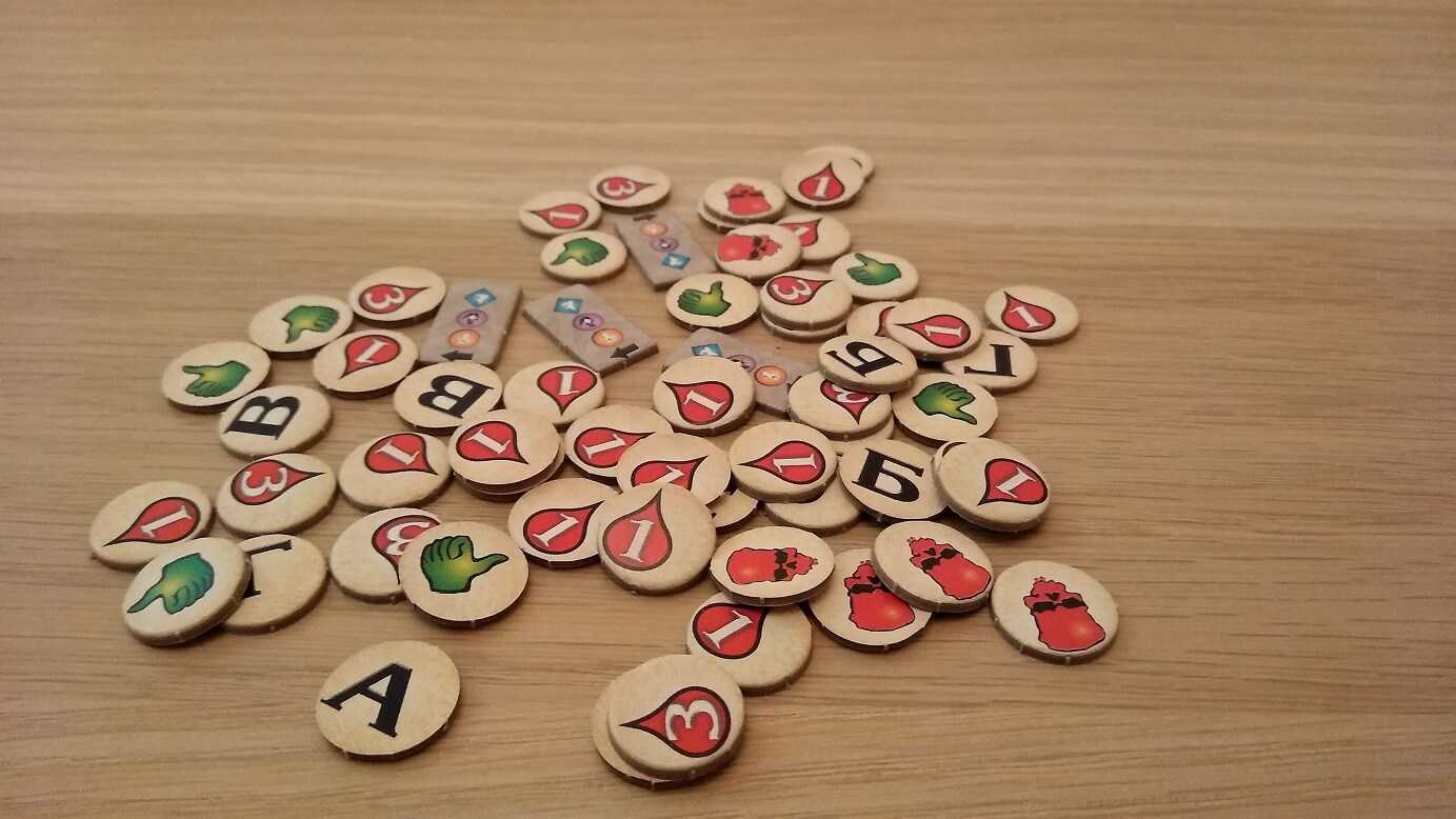 4. 60 жетонов риска, славы, здоровья, слежения, накладок уровней.