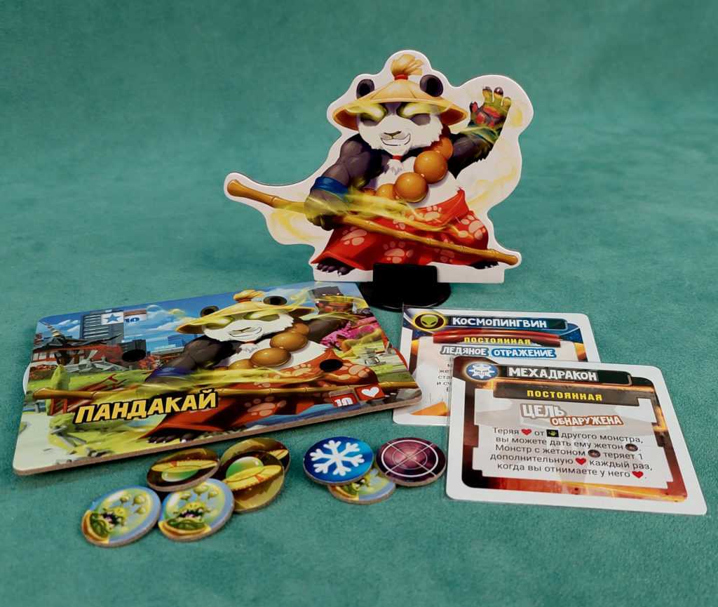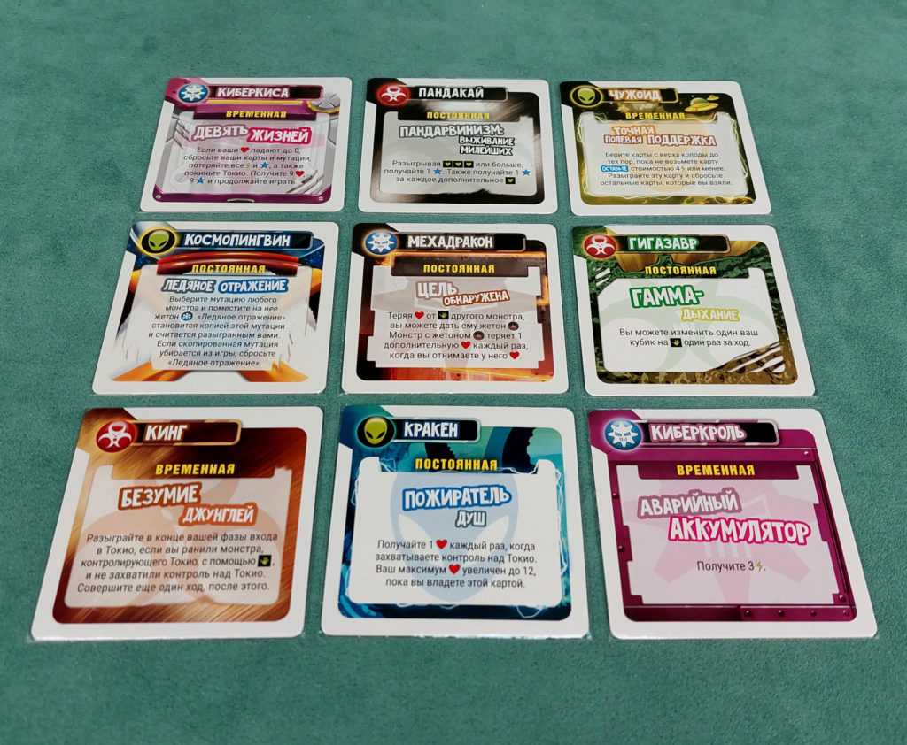 До этого игровой процесс за Инопланетянина (Чужоид) ничем не отличался от Конга и прочих. С новым дополнением каждый монстр обрел свой характер. Гигазавр заточен на контроль Токио, нанесение урона и вынуждает других игроков терять победные очки, показывая «кто в доме хозяин». Одно из свойств позволяет сбрасывать хвост и не получать урон – очень забавно и тематично для гигантской рептилии. Эволюция у Кибер Кисы неравнодушна к цифре «1» на кубиках и вобрала в себя отсылки к семейству кошачий: 9 жизней, всегда приземляется на лапы и т.д. Меха-Дракон – типичный механический монстр с кучей возможностей по нанесению урона и прочими прибомбасами, вроде, автонаведения, усиливающего атаки по агрессору. Кинг – типичное клише из фильмов про Конга: все стремления направлены на захват города. У Чужоида – все не как у людей! Инопланетянин будет пытаться набирать хитрые комбинации и отыгрывать через карты способностей. Космо-Пингвин играется под минусовую температуру, замораживая противников с девизом: «никому не двигаться!» Панда Кай – отражает пословицу «ни себе, ни людям». Постоянные выкрутасы с победными очками, захватом и выходом из Токио и прочие действия, направленные на сохранение баланса. Не забыли и про парочку: Кракен и Кибер-Кроль из первого издания. Кракен – воплощение неотвратимой угрозы. Постоянное увеличение здоровья и лечение делают его очень опасным в затяжных партиях. Кибер-Кроль – прямая отсылка к кролику из рекламы Энерджайзер: сплошная милота и энергия.