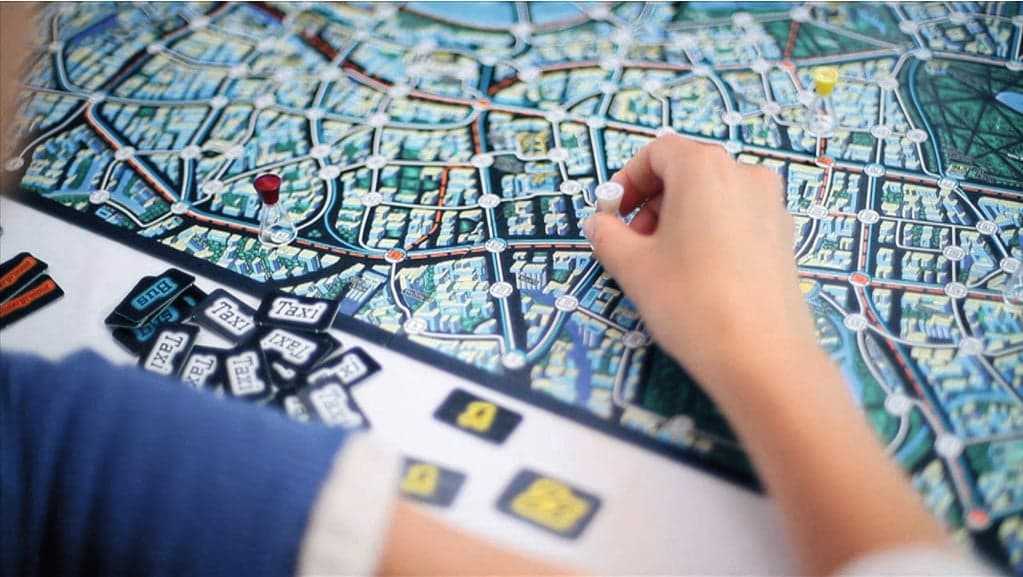 Поездка на такси возможна практически в любой точке карты, но только до ближайшего перекрестка. Сесть на автобус можно только если предыдущий ход закончился на автобусной остановке (они помечены красным кругом). Ехать на метро можно тоже только в случае, если предыдущий ход закончился на станции метро (они помечены синей полосой). Перескакивать несколько остановок нельзя, перемещаться можно только между точками, соединенными соответствующие линией (желтой для такси, красной для автобуса и синей для метро).