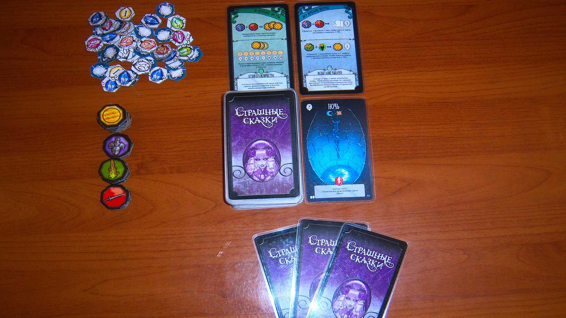 Меняющиеся правила — отличная идея, но, на мой взгляд, в «Страшных сказках» она реализована довольно слабо. То ли автор заранее решил приберечь сценарии для дополнений, то ли издатели поджимали со сроками. В итоге и сценариев мало, и игру кардинально они не меняют. Каждая комбинация сценариев обязательно задействует все существующие виды жетонов (иначе бы часть карт стала бесполезна), а значит изменятся лишь их свойства, но не условия игры. Собирать-то все равно придется их все.