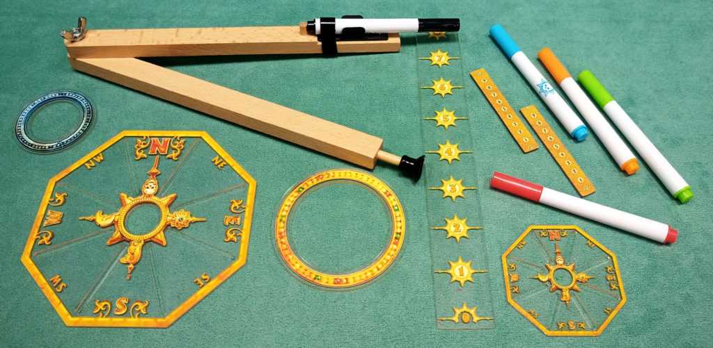 А вот коробка полна сюрпризов. Циркуль, линейки, компасы, маркеры и многое другое. Если ранее не был знаком с игрой, такой набор вызывает не поддельный интерес, особенно к тому, как это будет работать на практике. Но тысяча чертей на румбу, давайте по порядку.
