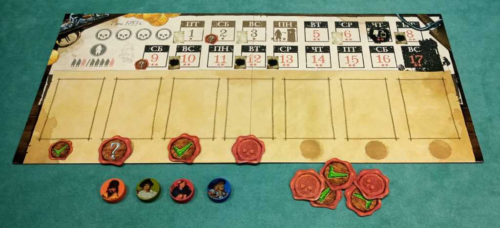 8 жетонов достоверности – главная изюминка игры. Подсказки от Джонна Сильвера выкладываются на планшет календарь. А под каждую подсказку в закрытую выкладывается жетон достоверности. На всех 8 жетонах, за исключением двух жетонов с вопросом, изображена галочка. У каждого игрока есть действие, которым он тайно может проверить, что изображено на жетоне под той или иной подсказкой. Если изображена галочка — подсказка правдива, а если изображен вопрос — подсказка может быть, как правдива, так и враньем. Таким образом, Джонн Сильвер запутывает игроков, заставляя их метаться по карте и приближая свою победу.