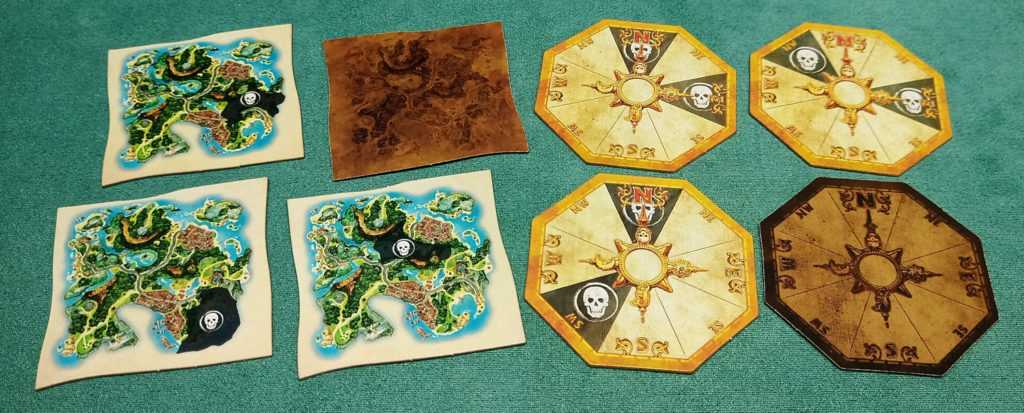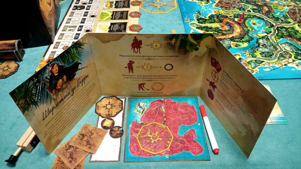 4 двусторонние мини-карты и листа для записей. На мини-карте и листе для записи каждый для себя делает пометки, помогающие в поисках спрятанного сокровища. Картон покрыт глянцевой бумагой, поэтому маркер легко стирается.