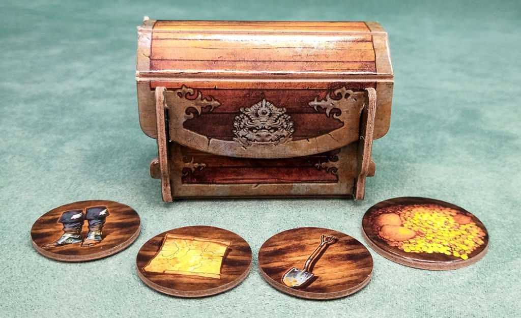 6 жетонов сундуков, 1 жетон сокровища и 1 сундук. 6 жетонов сундуков, это дополнительные полезные бонусы и информация, которые Джонн Сильвер может дать любому игроку. А Джонн Сильвер получит возможность использовать подсказку «Черная метка» с изображенным на них сундуком. Это особые подсказки, которые помогут запутать игроков еще сильнее.