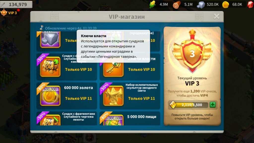 Каждую неделю обладатели VIP-10 в игре Rise of Kingdoms могут в VIP-магазине покупать ключи власти для события “Легендарная таверна”. Стоимость одного ключа составляет 600 самоцветов. Всего можно купить 40 ключей в течение недели. В обычном магазине 1 ключ власти стоит 1,000 самоцветов.