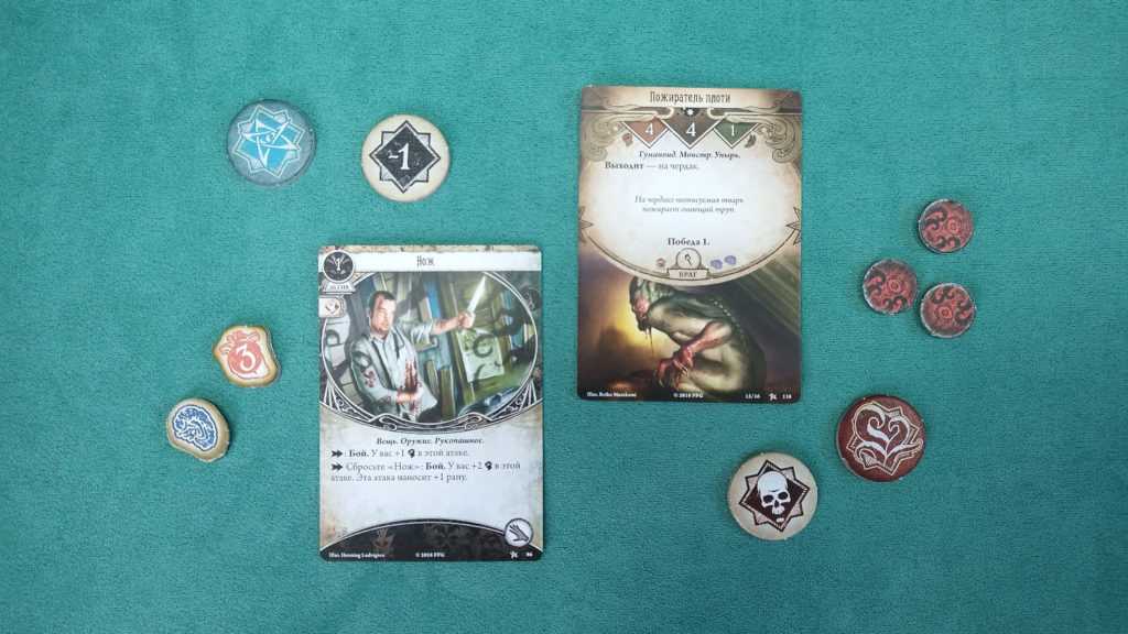Жетоны с ними представляют существ, которые очутились на улицах мистического Аркхэма. С лицевой стороны сыщик найдет ответ, какое направление движения у соперника, с обратной – насколько он силен в сражении. Когда сущность в «Ужасе Аркхэма» проходит по городу, его жетон повернут лицом, а в начале драки его переворачивают.