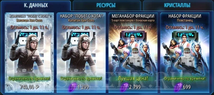 Здесь на других вкладках также можно купить кредиты, тренировочных дроидов за кристаллы. Или сами кристаллы за реальные деньги