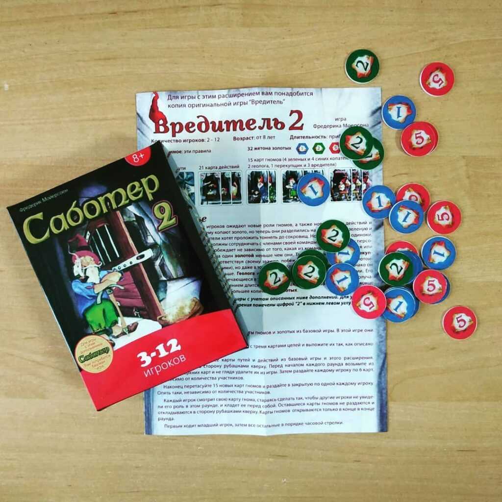 Saboteur 2 увеличивает возможности базовой игры и делает ее командной. Теперь золотоискатели принадлежат к одному из двух кланов: синему или зеленому. В дополнении появляются и новые роли. Для этой версии игры «Гномы-вредители» инструкция несколько отличается. Некоторые гномы теперь работают в одиночку.