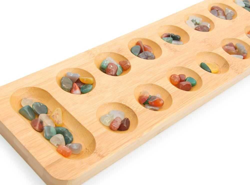 Набор выглядит, как деревянная доска с выемками под самоцветы и Калахом — углублением, в которое в итоге нужно переложить все свои драгоценные камни. Для каждого игрока есть своя сторона поля, на котором вы будете играть. Механика развлечения достаточно простая, чтобы дети могли сражаться со взрослыми наравне. Участники на протяжении всей борьбы должны выбирать эффективную стратегию, чтобы получить дополнительные ходы и лишить противника преимущества. В игре вы можете даже лишить врага камней и разрушить его тактику, если правильно проанализировать его действия.