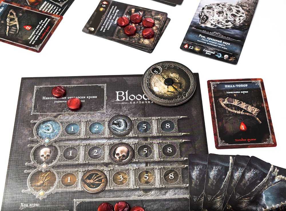 Bloodborne неплоха исполнением: мне запомнились красные фишки «крови», которые с легкостью можно применить в других настольных играх. В остальном стандартно: плотные планшеты, круговые счетчики жизни и комплект карт.