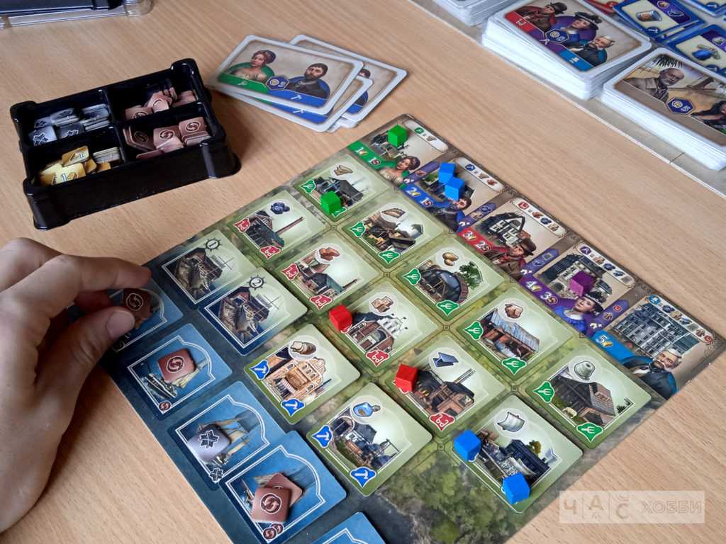 Добились этого за счет кучи игровых компонентов: нескольких видов карт, множества жетонов вроде ресурсов, монет и выдающихся деятелей. Исполнением мне понравилась карта, которая постепенно расширяется и где мы собираем ценные ресурсы. А какие тут фишки, особенно милые пластиковые тележки, притворяющиеся разведчиками.