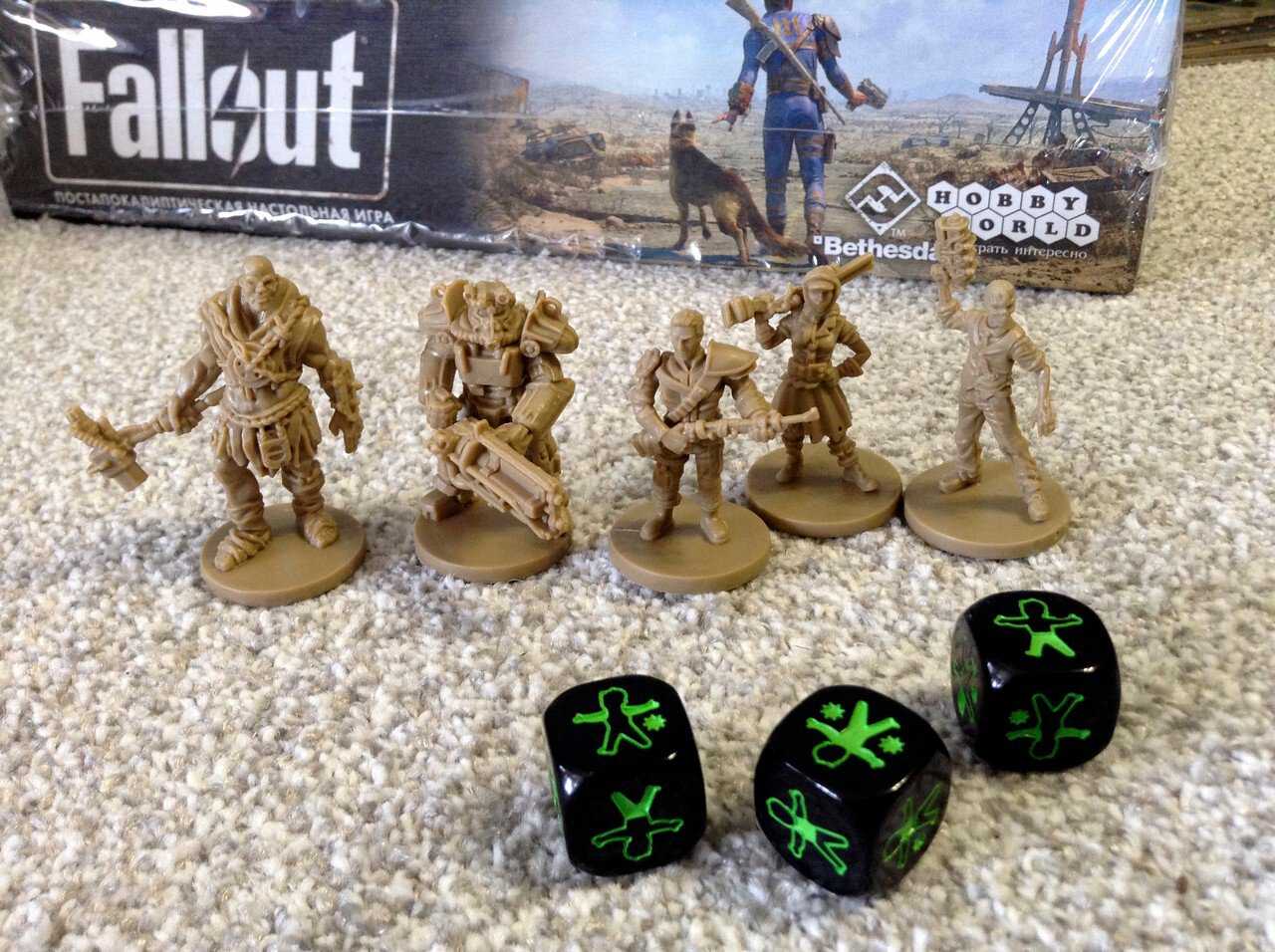 Fallout еще и классно оформлена, здесь даже есть несколько миниатюр. Мне понравились кубики, которые помимо внешнего вида еще и грамотно обыгрывают механику повреждений героя.
