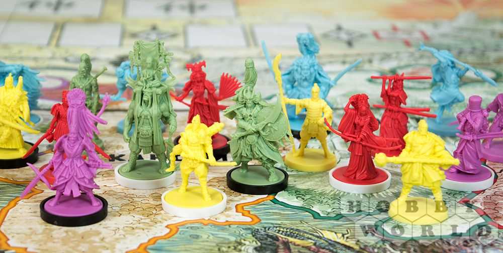 В комплект входит 58 пластиковых фигур. Все они имеют высокую детализацию – особенно фигурки монстров. Фигурка дракона просто шикарна. Помимо этого, к ним идут 40 цветных крупных подставок. Перед началом надо подготовить не только игровое поле, но и сесть всем соперникам в определённом порядке, желательно за традиционным японским котацу.