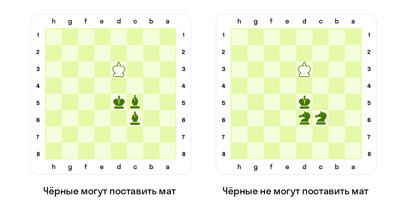 Два слона и король ставят мат, а два коня и король, как правило, нет.