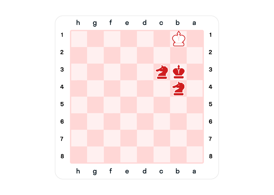В позиции с двумя конями тоже может быть непросто. Чтобы не попасться в матовую ловушку, нужно остерегаться полей a1, h1, a8, h8, и тогда игра точно закончится ничьей.