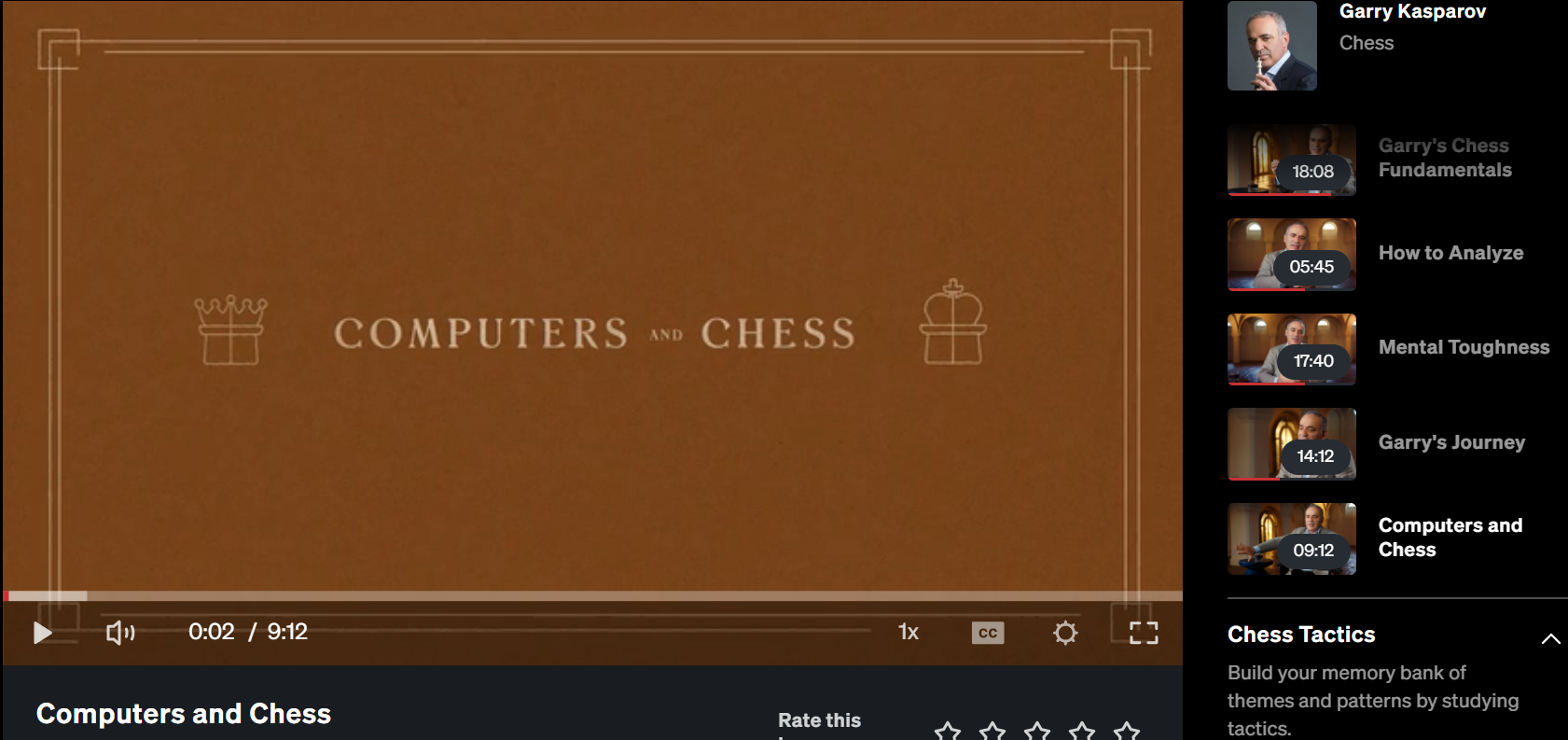 После короткого вводного видео следует 18-минутное видео об идеях высокого уровня, в котором Каспаров обсуждает разницу между тактикой и стратегией и важность повторения для распознавания образов. Шахматы действительно являются спортивным занятием столетней давности, которое вдохновило множество книг на теорию, лучшую игру, превосходства и худшие цвета шахмат. Когда вы изучаете шахматы, большая часть классической древности уходит на расшифровку этих атак