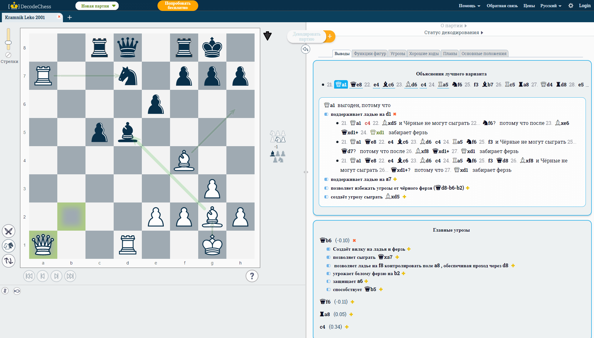 DecodeChess не только показывает правильный ход, но и объясняет его человеческим языком (причем на русском языке), в отличие от других программ-конкурентов. Сервис основан на искусственном интеллекте который работает на движке Stockfish 12. На сайте вы можете не только анализировать партии, но и играть с ИИ который будет адаптироваться к вашему уровню игру, чтобы дать вам хоть какой-то шанс его обыграть.