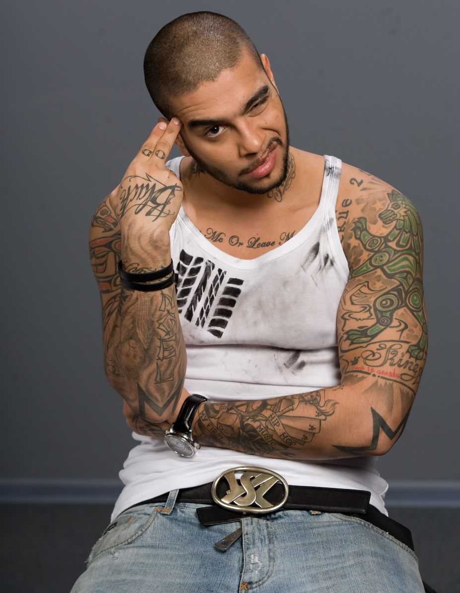 Многие звезды с тату связаны с хип хоп искусством. Так и московский рэпер Алексей Долматов, известный под псевдонимом Гуф, владелец массы татуировок. Среди них: граната на правом плече, револьвер, имя сына и пр. Но самая известная тату – эскиз Москвы на спине.