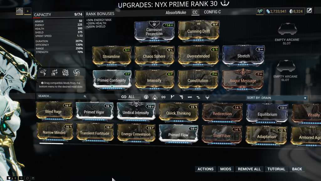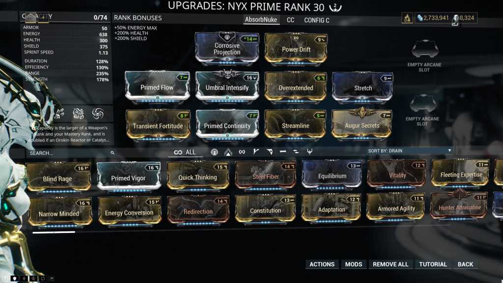 Билд У нас все будет по простому, по бедному я бы сказал, но реактор придется вставить в варфрейма. Пойдем мы в контроль, как известно: кто контролирует ситуацию, тот командует боем. На помощника рекомендую поставить мод на сборку сфер энергии или взять Стража-Носителя так, как в время боя нам будет не до этого.