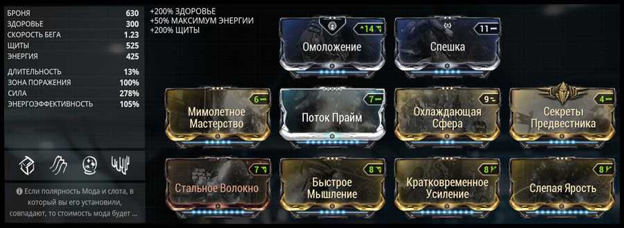 - Слепая Ярость, Кратковременное усиление и Секреты Предвестника максимально поднимают параметр силы. Секреты Предвестника можно заменить на мод Усиление. У меня Секреты Предвестника установлены по причине подходящей полярности. Если установите мод Усиление — незначительно увеличите Силу, но не критично.
