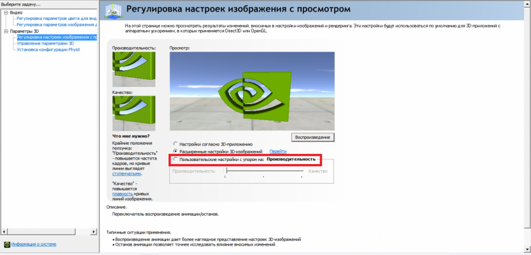 Обладателям видеокарт от NVIDIA первым делом советуем отрегулировать настройки изображения в панели управления NVIDIA. Скачав и установив самые последние драйвера для своей видеокарты, зайдите в раздел «регулировка настроек изображения с просмотром» и передвиньте ползунок на «Производительность».