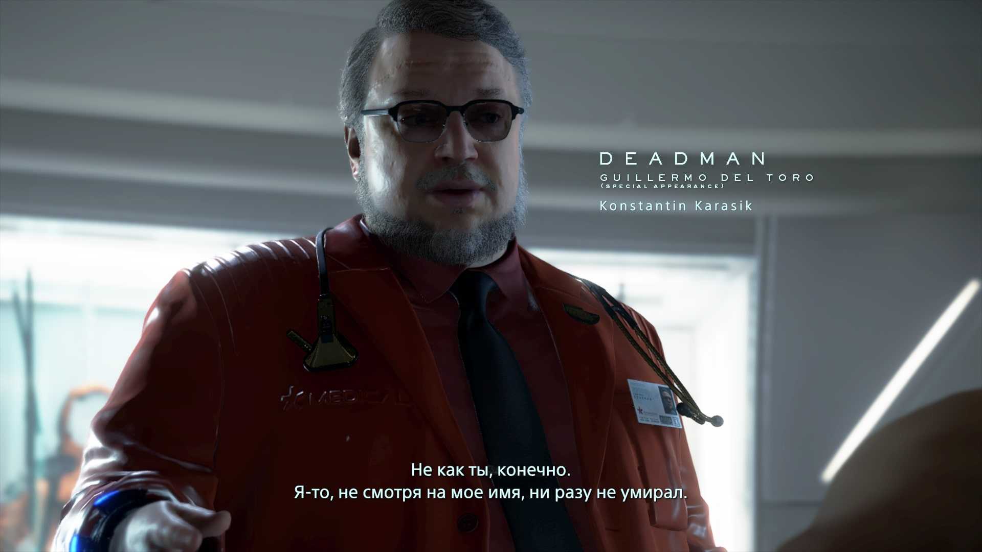 При знакомстве с персонажами указаны имена реальных актеров и актеров русской озвучки — на скриншоте специальный гость игры Гильермо Дель Торо в роли Дедмэна, озвученный Константином Карасиком.