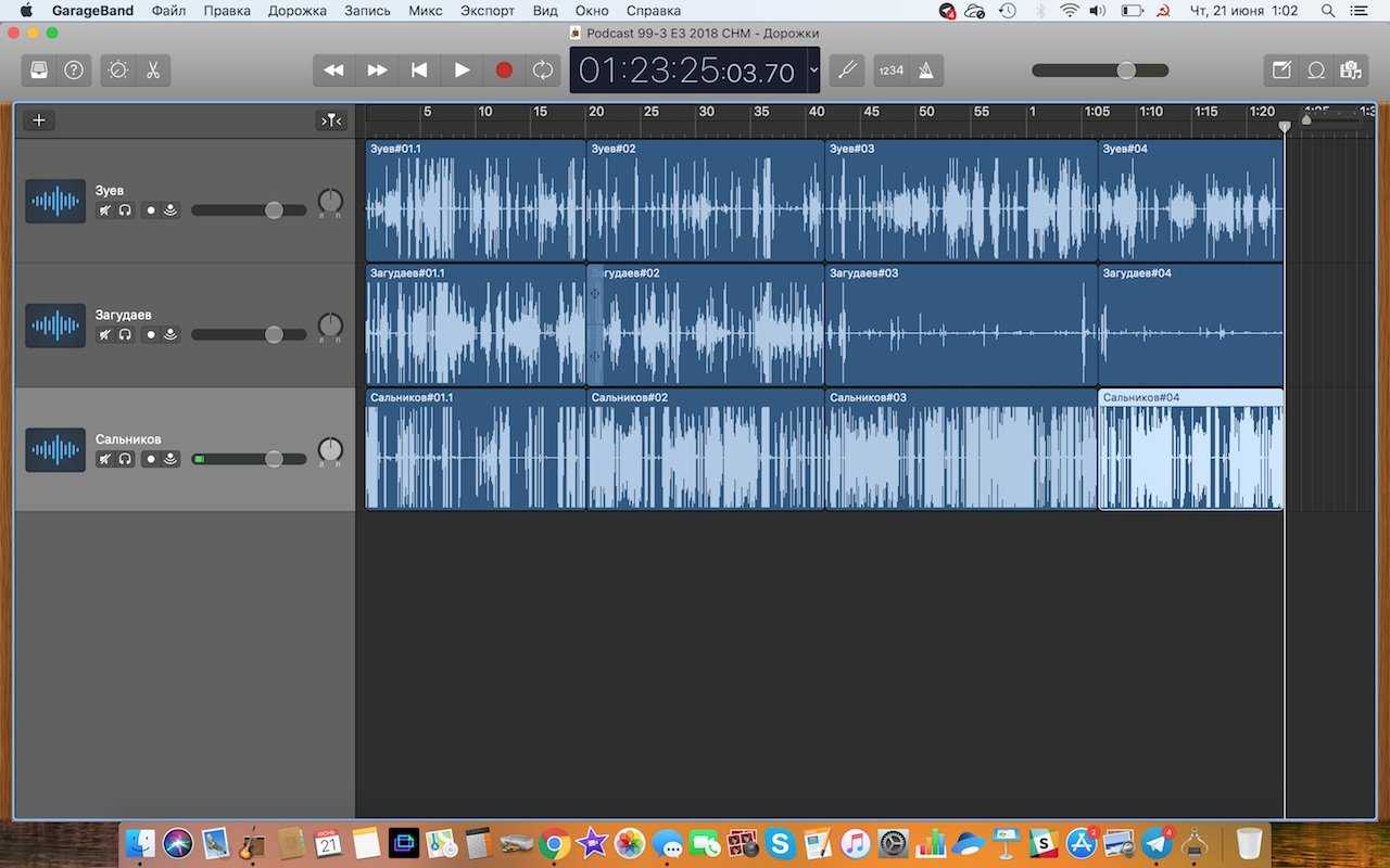Вот так выглядит записанный материал в проекте. Общая длительность — 1 час 23 минуты; под конец Загудаев куда-то исчез; видны три перерыва — вертикальные «щели» между четырьмя сегментами записанного аудио.