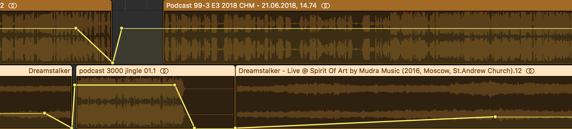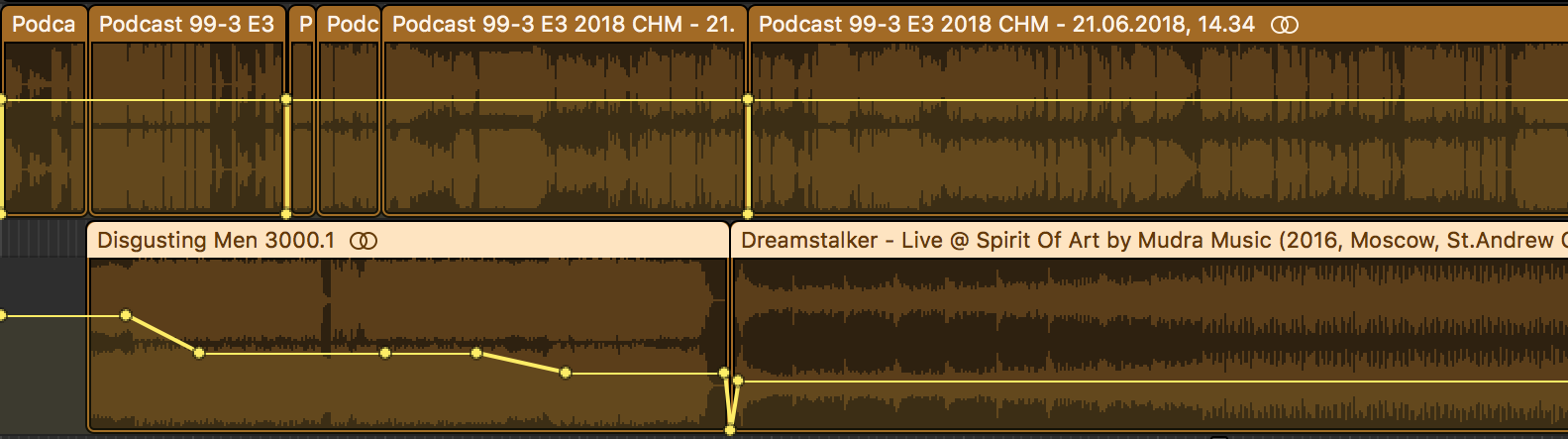 Дорожка ниже занята музыкой и отбивками. Желтая полоса с точками, которая изгибается на протяжении всей фонограммы — это автоматизация. Автоматизация позволяет менять уровни громкости дорожек наиболее тонким и точным образом. Вот как изгибается кривая громкости нашей заставки: полноголосое вступление, затем небольшой спад в момент представления ведущих, затем съезд еще ниже, когда мы уже начинаем беседовать, а затем уход в полную тишину с последующим возникновением из нее музыкального фона.