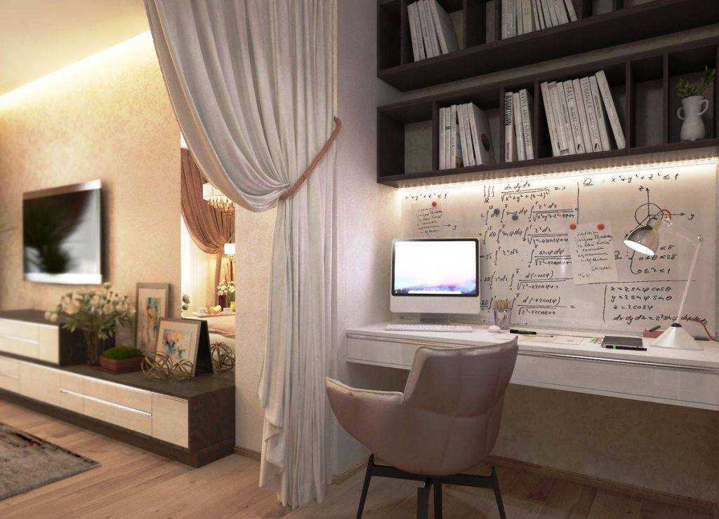 Организация рабочего места в гостиной практикуется часто. Еще на стадии проведения ремонтных работ обозначается точка дислокации оргтехники. Как правило, место выбирается у окна. При наличии двух окон в зале, компьютерный стол размещается между проемами.