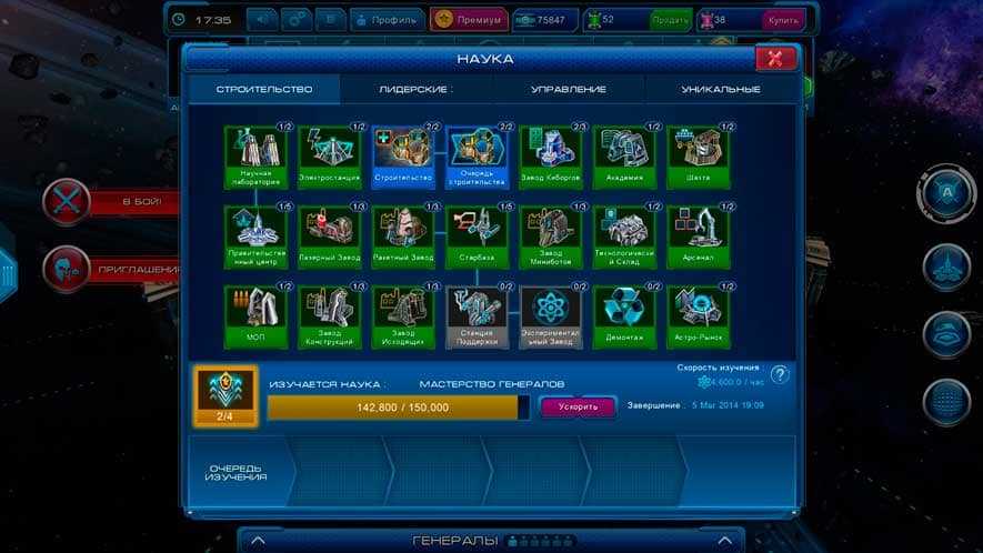 - Перед совершением первой атаки, даже на ботов (AI), нужно не только достойный флот сколотить, но и прокачать генералов, так как они дают существенные бонусы и усиливают вашу армаду.