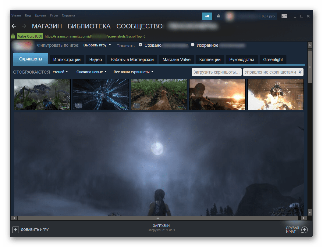 - Откроется универсальное окно менеджера, где можно быстро увидеть нужные снимки или закачать то, что вы случайно не сделали. Сделать это можно очень просто — достаточно выбрать игру, затем само изображение, добавить для него описание, по необходимости пометив его как спойлер, и нажать на «Загрузить».